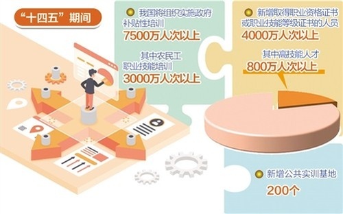 為提升勞動(dòng)者就業(yè)創(chuàng)業(yè)能力,滿足產(chǎn)業(yè)轉(zhuǎn)型升級(jí)和技術(shù)進(jìn)步的要求,“十四五”期間,我國(guó)將組織實(shí)施政府補(bǔ)貼性培訓(xùn)達(dá)7500萬(wàn)人次以上,其中農(nóng)民工職業(yè)技能培訓(xùn)3000萬(wàn)人次以上;新增取得職業(yè)資格證書(shū)或職業(yè)技能等級(jí)證書(shū)的人員達(dá)到4000萬(wàn)人次以上,其中能夠達(dá)到高級(jí)技工、技師、高級(jí)技師的高技能人才達(dá)到800萬(wàn)人次以上;新增公共實(shí)訓(xùn)基地200個(gè)。