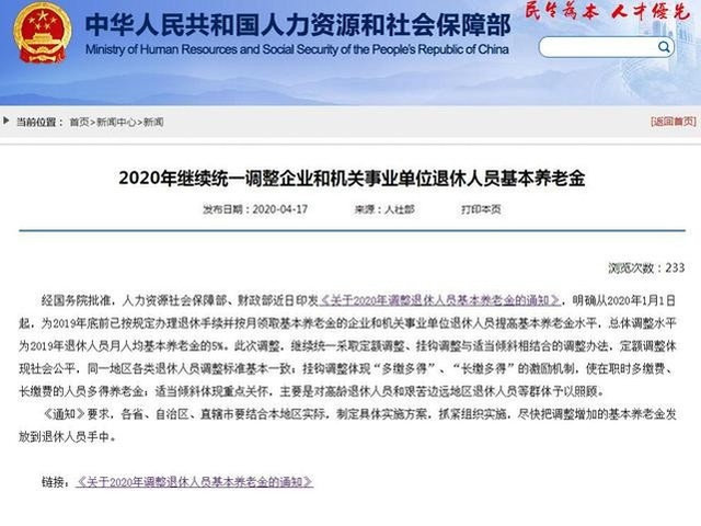 經(jīng)國(guó)務(wù)院批準(zhǔn),人力資源社會(huì)保障部、財(cái)政部近日印發(fā)《關(guān)于2020年調(diào)整退休人員基本養(yǎng)老金的通知》,明確從2020年1月1日起,為2019年底前已按規(guī)定辦理退休手續(xù)并按月領(lǐng)取基本養(yǎng)老金的企業(yè)和機(jī)關(guān)事業(yè)單位退休人員提高基本養(yǎng)老金水...