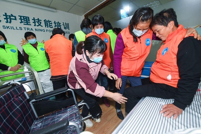 2021年10月21日,浙江省杭州市臨安區(qū)養(yǎng)老護理員培訓基地的老師(前排右三)給養(yǎng)老護理員及黨員志愿者開展養(yǎng)老護理專業(yè)技能培訓。