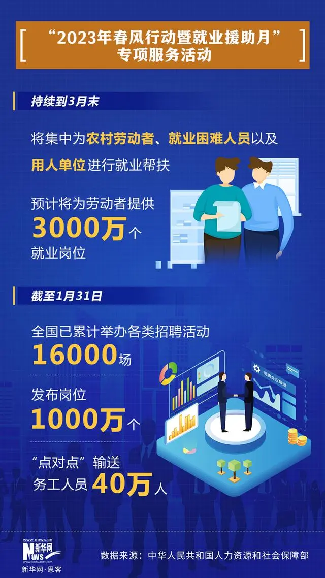 為進(jìn)一步促進(jìn)就業(yè)、保障用工,人社部等11個部門啟動“2023年春風(fēng)行動暨就業(yè)援助月”專項服務(wù)活動,幫助有就業(yè)創(chuàng)業(yè)意愿的農(nóng)村勞動者、符合認(rèn)定條件的就業(yè)困難人員以及有用工需求的用人單位,通過全面組織就業(yè)摸排,精準(zhǔn)開展對接服務(wù),提供就業(yè)服務(wù)、技能培訓(xùn)、權(quán)益維護(hù)全方位服務(wù)。