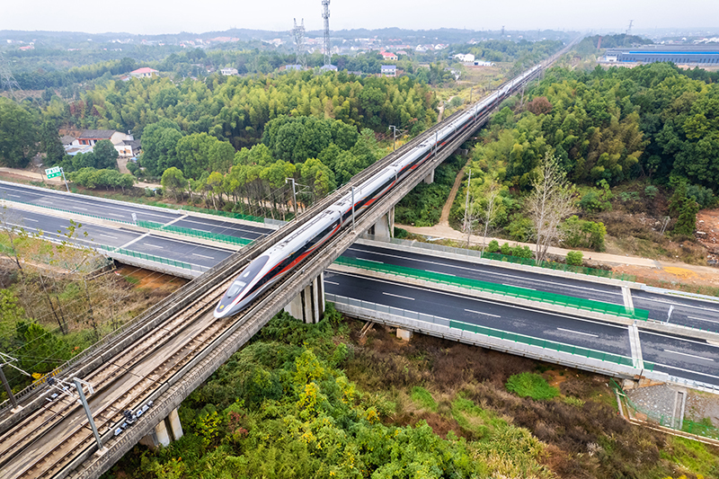 高鐵列車從湖南省首條智慧高速——湖南平江(湘贛界)至益陽高速公路上方駛過(2022年11月28日攝,無人機照片)。新華社記者 陳思汗 攝