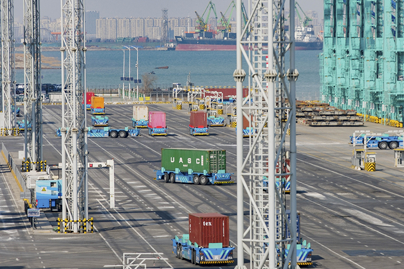 智能水平運輸機器人在天津港全物聯(lián)網(wǎng)集裝箱碼頭作業(yè)(2023年2月21日攝)。新華社記者 張鋮 攝