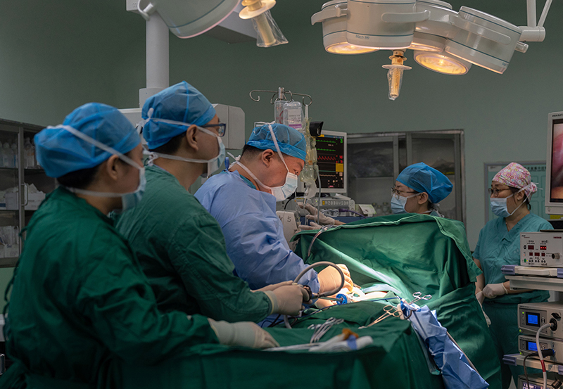 在北京市第六醫(yī)院的醫(yī)聯(lián)體胸外科病房手術室,北京協(xié)和醫(yī)院與北京市第六醫(yī)院的醫(yī)護人員進行團隊協(xié)作開展胸腔鏡手術(2021年6月3日攝)。新華社記者 才揚 攝